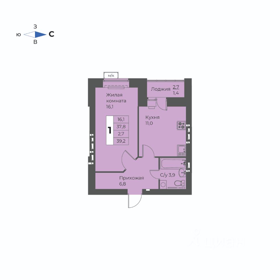 1-комн. квартира, 39,2 м²