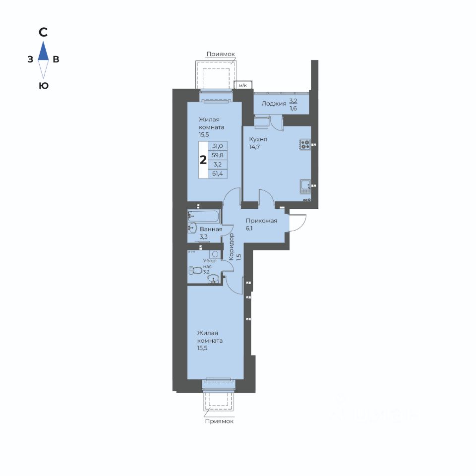 2-комн. квартира, 61,4 м²