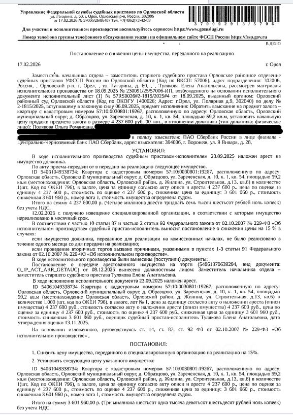 Помещение, назначение: жилое, площадь 59,2 кв.м., кадастровый номер 57:10:0030801:19267, адрес: Российская Федерация, Орловская область, муниципальный округ Орловский, д. Образцово, ул. Зареченская, дом 10, корпус 1, кв. 54. Согласно ответу ООО "РКЦ-Система расчетов" ООО "Альтаир" от 11.11.2025 по данному адресу зарегистрированных лиц нет. Сведениями о задолженности по взносам на капитальный ремонт Организатор торгов не располагает. Залогодержатель: ПАО "Сбербанк России". Начальная цена: 3 601 960 (Три миллиона шестьсот одна тысяча девятьсот шестьдесят) руб. 00 коп., без НДС, сумма задатка: 170 000 (Сто семьдесят тысяч) руб. 00 коп. Шаг аукциона 1%: 36 019 (Тридцать шесть тысяч девятнадцать) руб. 60 коп.