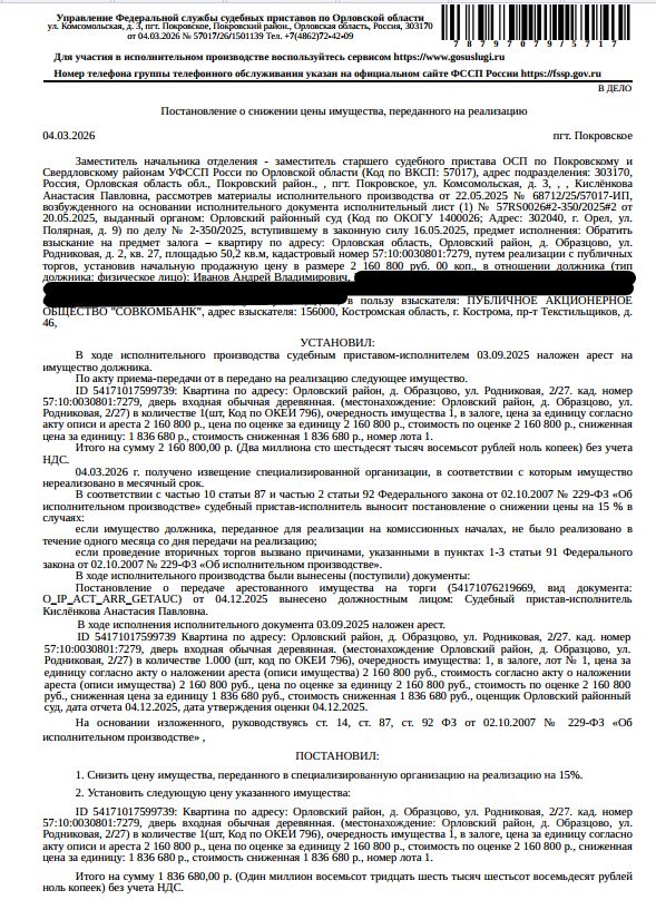 Помещение, назначение: жилое, наименование: квартира, площадь 50,2 кв.м., кадастровый номер 57:10:0030801:7279, адрес: Российская Федерация, Орловская область, м.о.Орловский, д. Образцово, ул.Родниковая, д. 2, кв. 27. Согласно ответу ООО "Жилсервис Орловского района" от 26.11.2025 по данному адресу зарегистрированных лиц нет. Согласно справке НО "РФКР" задолженность по взносам на капитальный ремонт по состоянию на 30.09.2025 составляет 41 102,22 руб. Залогодержатель: ПАО "Совкомбанк". Начальная цена: 1 836 680 (Один миллион восемьсот тридцать шесть тысяч шестьсот восемьдесят) руб. 00 коп., без НДС, сумма задатка: 90 000 (Девяносто тысяч) руб. 00 коп. Шаг аукциона 1%: 18 366 (Восемнадцать тысяч триста шестьдесят шесть) руб. 80 коп.