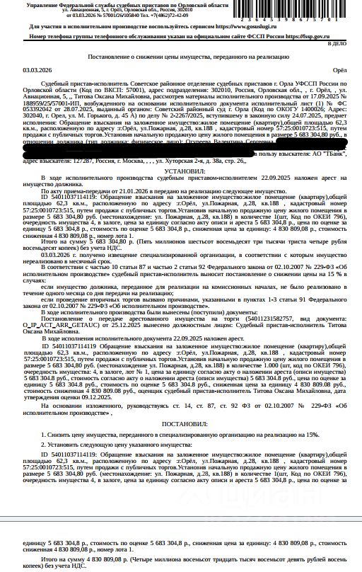 Помещение, назначение: жилое, наименование: квартира, площадь 62,3 кв.м., кадастровый номер 57:25:0010723:515, местоположение: Российская Федерация, Орловская область, г Орёл, ул Пожарная, д 28, кв 188. Согласно ответу ООО "РКЦ-Система Расчетов" ООО "Орелжилэксплуатация" от 09.12.2025 по данному адресу зарегистрировано 3 человека, в том числе 1 несовершеннолетний. Согласно справке НО "РФКР" от 08.12.2025 задолженность по взносам на капитальный ремонт отсутствует. Залогодержатель: АО "ТБанк". Начальная цена: 4 830 809 (Четыре миллиона восемьсот тридцать тысяч восемьсот девять) руб. 08 коп., без НДС, сумма задатка: 240 000 (Двести сорок тысяч) руб. 00 коп. Шаг аукциона 1%: 48 308 (Сорок восемь тысяч триста восемь) руб. 09 коп.