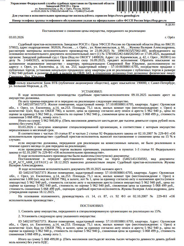 Помещение, назначение: жилое, наименование: квартира, площадь 75,1 кв.м., кадастровый номер 57:10:0030801:6705, местоположение: Орловская область, г Орёл, ул Емлютина, д 14, кв. 253. Согласно ответу УМВД России по Орловской области по данному адресу граждан, зарегистрированных по месту жительства (пребывания) не значится. Сведениями о задолженности по взносам на капитальный ремонт Организатор торгов не располагает. Залогодержатель: Банк ВТБ (ПАО). Начальная цена: 5 068 499 (Пять миллионов шестьдесят восемь тысяч четыреста девяносто девять) руб. 00 коп., без НДС, сумма задатка: 250 000 (Двести пятьдесят тысяч) руб. 00 коп. Шаг аукциона 1%: 50 684 (Пятьдесят тысяч шестьсот восемьдесят четыре) руб. 99 коп.