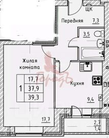 Общая площадь квартиры 37, 9 кв. м. ( без учета лоджии). жилая-17,7 кв. м., кухня-9,4 кв. м.