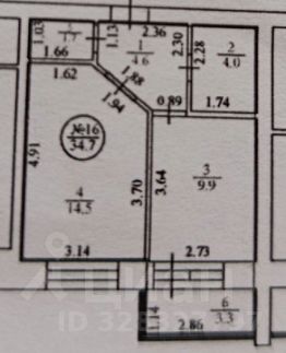 Общая площадь квартиры 34,7 кв.м ( без учета площади лоджии): комната - 14,5 кв.м, кухня - 9,9 кв.м., санузел - 4,0 кв.м., коридор - 4,6 кв.м., кладовка - 1,7 кв.м., лоджия - 2,86 кв.м.