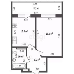 Общая площадь 48 кв.м включает просторную комнату 16,5 кв.м, кухню 12,3 кв.м и лоджию 8,2 кв.м, что создает ощущение простора и комфорта. В квартире выполнен ремонт: полы на кухне и в коридоре выложены плиткой, в комнате уложен ламинат.