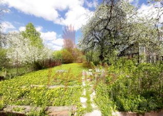 Много плодовых деревьев: сливы, яблони, вишни, черешни, абрикосы, малина, смородина, большое количество цветов.