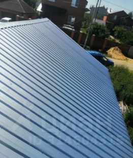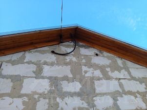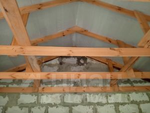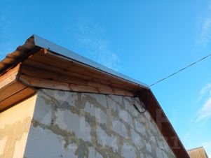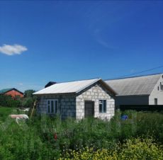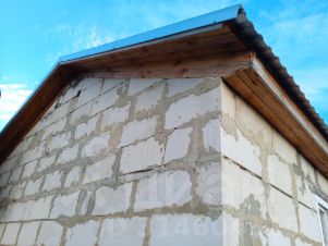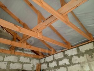 Дом из газоблоков. Без отделки. Два окна, дверь. Двухскатная крыша, стропила, пароизоляционная пленка покрыта кровельным оцинкованным профилем.