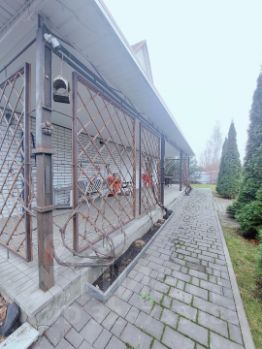 Благоустроенный двор - тротуарная плитка, забор, ворота с электроприводом. Во дворе чисто, много зелени, дорожки вокруг дома. Есть вольер для собаки, а также на заднем дворе сарай.